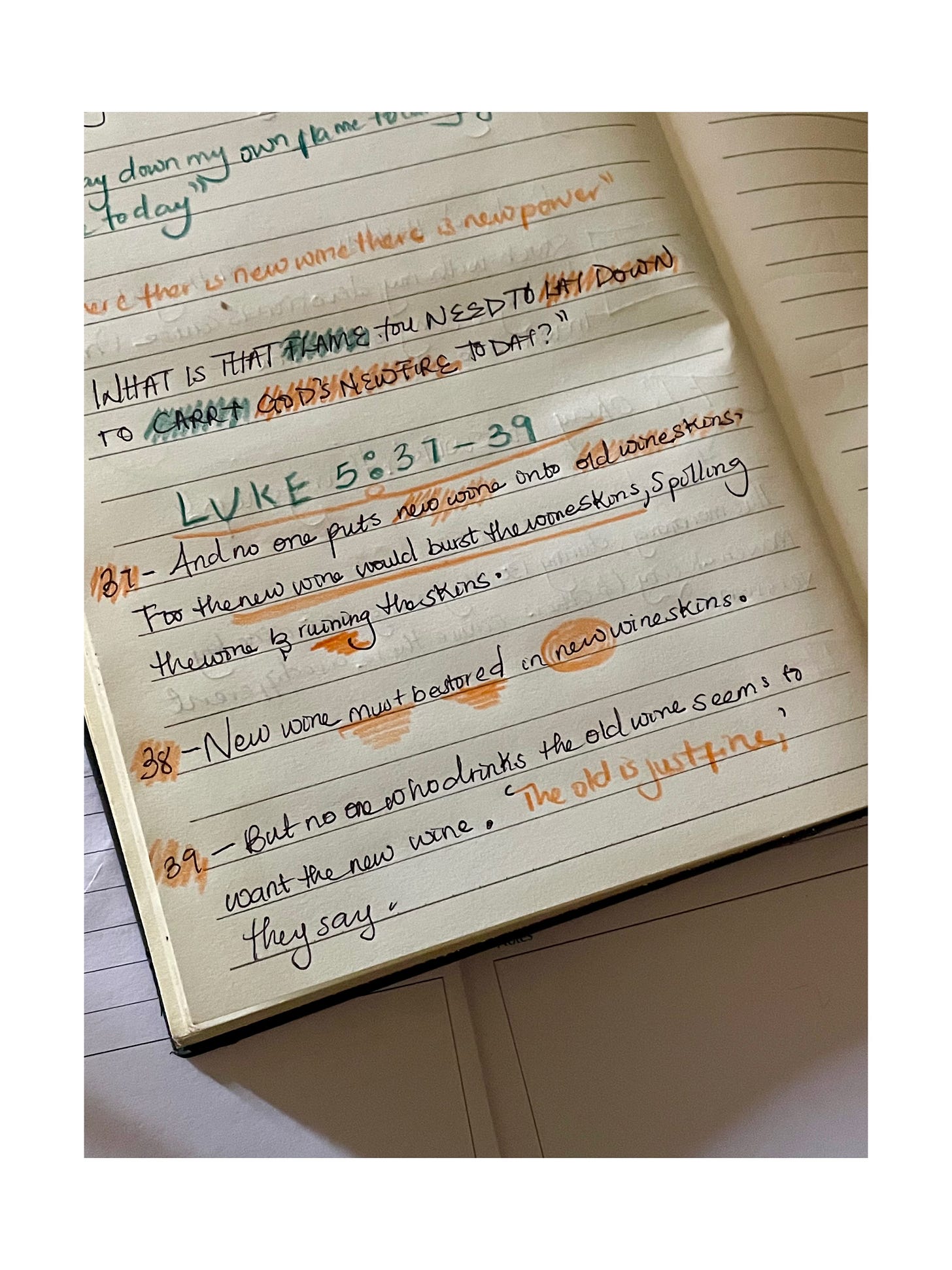 And no one puts new wine into old wineskins. For the new wine would burst the wineskins, spilling the wine and ruining the skins. New wine must be stored in new wineskins. But no one who drinks the old wine seems to want the new wine. ‘The old is just fine,’ they say.””